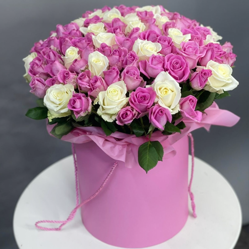 Композиция в шляпной коробке из 151 розы кения микс
